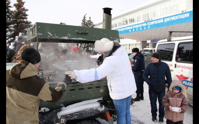 Для участников торжественного мероприятия на Площади Памяти Самарское региональное отделение партии "РОДИНА" организовало работу полевой кухни.